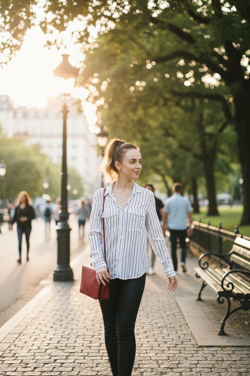 Удлинённый батник oversize с кожаными леггинсами и грубыми ботинками смотрится эффектно и удобно одновременно. Идеально для долгих прогулок и путешествий.