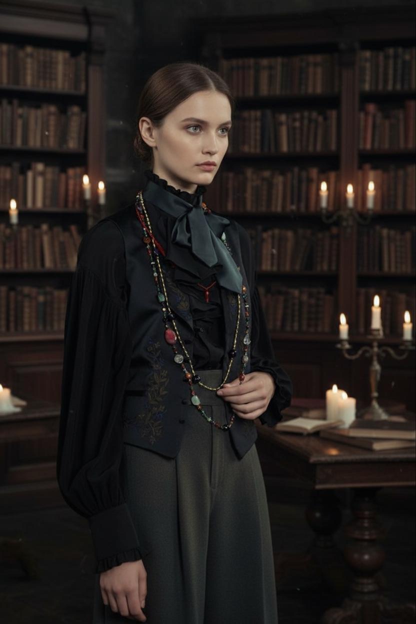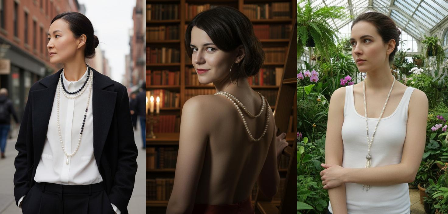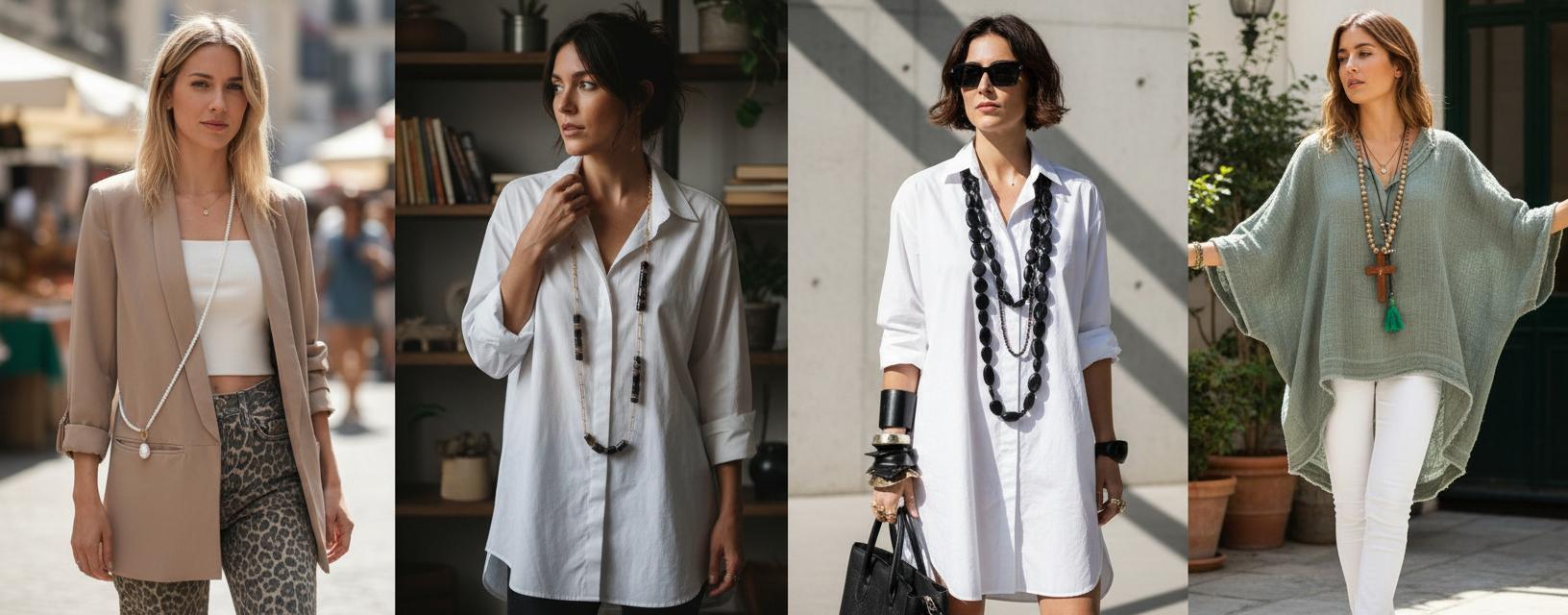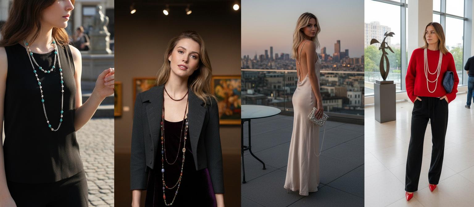 Для классических образов выбирайте сотуары из жемчуга или металла. Они идеально дополняют платья-футляры, костюмы или рубашки. Жемчужный сотуар можно носить поверх простого чёрного платья, добавляя элегантности и утончённости. Обвив нить вокруг шеи несколько раз, вы создадите многослойный эффект, который выглядит изысканно.