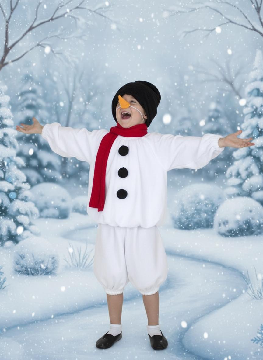 Костюм снеговика. Снеговик у современных детей ассоциируется с мультяшным героем, которого зовут Олаф. Для него подойдет белая футболка и шорты или белые спортивные штаны. На футболку достаточно приклеить черные пуговки, сделать маску на лицо или на голову, используя белую бейсболку, чешки украсить помпонами, а на руки можно надеть коричневые перчатки тем самым приблизив сходство с веточками-руками снеговика;