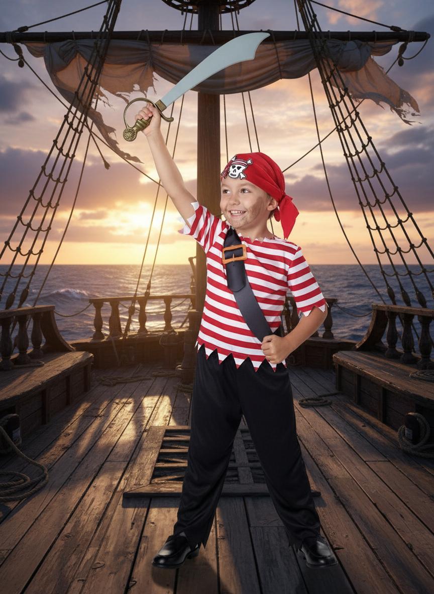 Костюм Пирата. Для этого костюма используют бадану, белую рубашку, широкий жилет. Для образа подбирают обувь, в которую можно заправить яркие брюки. Образ дополняют широким поясом, ремнем, бутафорским мечом;