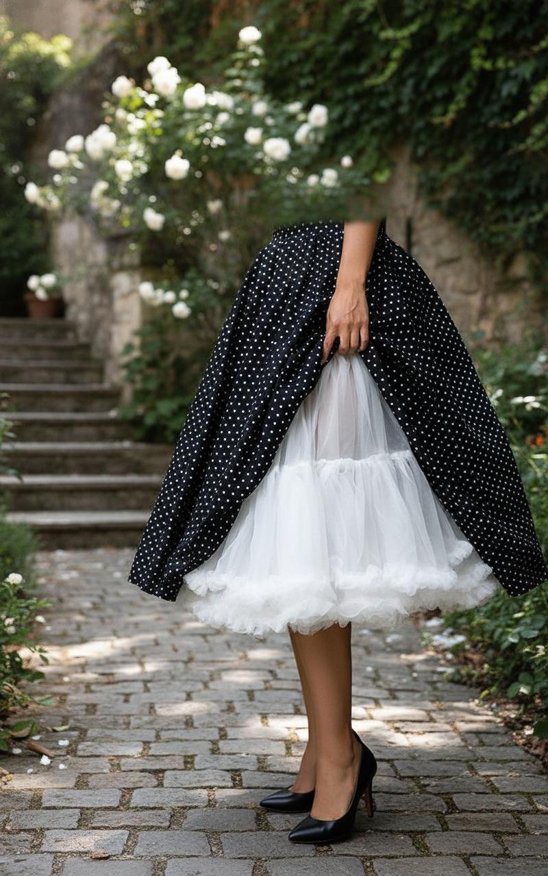 Итог: пышная юбка-клёш, которая красиво держит форму и «шуршит» по всем правилам ретро.
