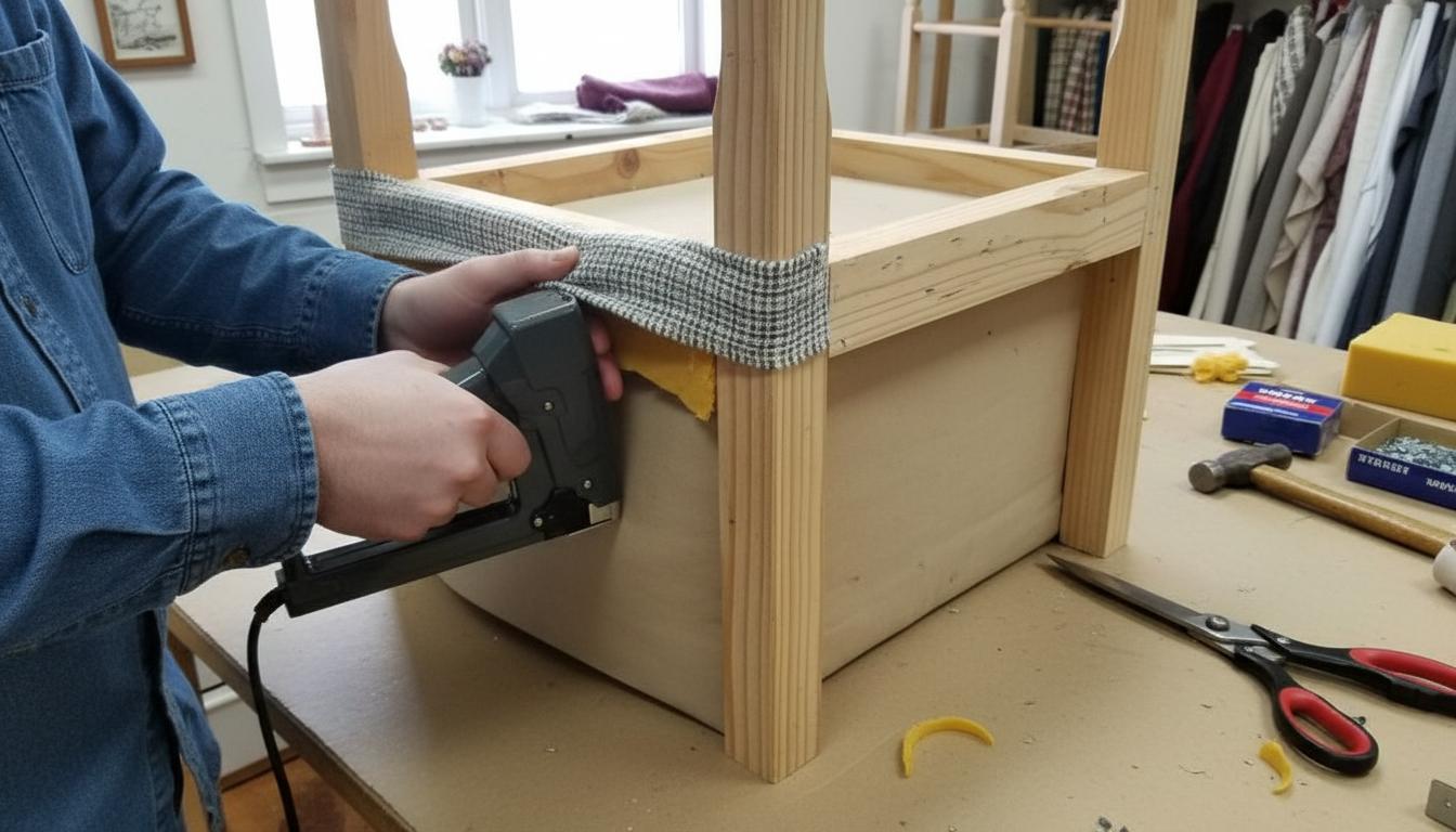 Когда наполнитель установлен, приступайте к обивке основания новой тканью. Этот процесс требует осторожности, чтобы избежать складок и обеспечить плотное прилегание ткани.