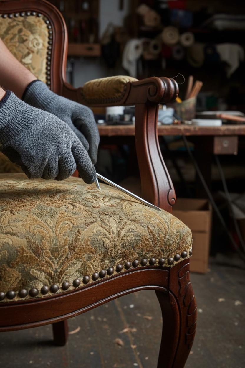 Демонтаж старой обивки — важный этап перетяжки стула, требующий аккуратности и внимания. Вот пошаговая инструкция:
