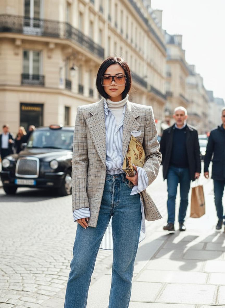Следите за пропорциями: если рубашка широкая — джинсы можно выбрать более узкие, и наоборот.