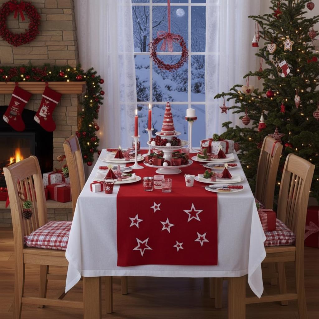 Но так уж повелось, что дома, например, такие атрибуты столового белья как наперон или мулетон не применяют. Основное текстильное украшение стола — это скатерть. Она повторяет форму стола и имеет тематическое украшение. Для праздничного украшения интерьера в Новый год выбирают скатерть в заданной тематике украшения стола. Это может быть стиль Прованс или японский стиль. Часто для этого используют готовые наборы текстиля или шьют скатерть на Новый год своими руками. В магазинах присутствует широкий ассортимент готовых скатертей и тканей, подходящих для пошива скатерти, поэтому подобрать желаемый цвет скатерти на Новый год не составит труда. В тон скатерти подбирают салфетки или столовую дорожку. Данный текстиль может быть выполнен в одном ключе или быть другого декора, который будет красиво сочетаться со скатертью. Салфетки различают как настольные, так и наколенные. Некоторые используют в роли салфеток бумажные салфетки, красиво украшенные тематическим рисунком. Такие салфетки красивы сами по себе и легко утилизируются после использования. Столовая дорожка не что иное, как небольшая защита основной скатерти от различных проявлений застолья. Она может присутствовать на столе или ее может не быть. Часто столы украшают не только салфетками, но и специальными полотенцами. Они служат для защиты одежды от разного рода неприятностей. Некоторые блюда, особенно горячие, подают на специальных подставках, прикрывая их особым текстилем, который называется ручник. Во многих семьях ручник — это не что иное, как красивое полотенце так же подобранное в тон общего текстиля стола.