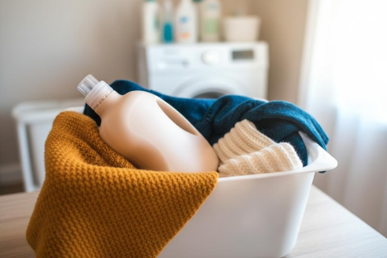 Не стоит в таких случаях применять бытовую химию так как возможна химическая реакция всего и вся. После замачивания, вещь стирают обычным способом. В конце можно добавить кондиционер без отбеливающих присадок. Прежде чем экспериментировать с разными компонентами нужно внимательно изучить состав ткани и выделить для эксперимента незаметный участок ткани.