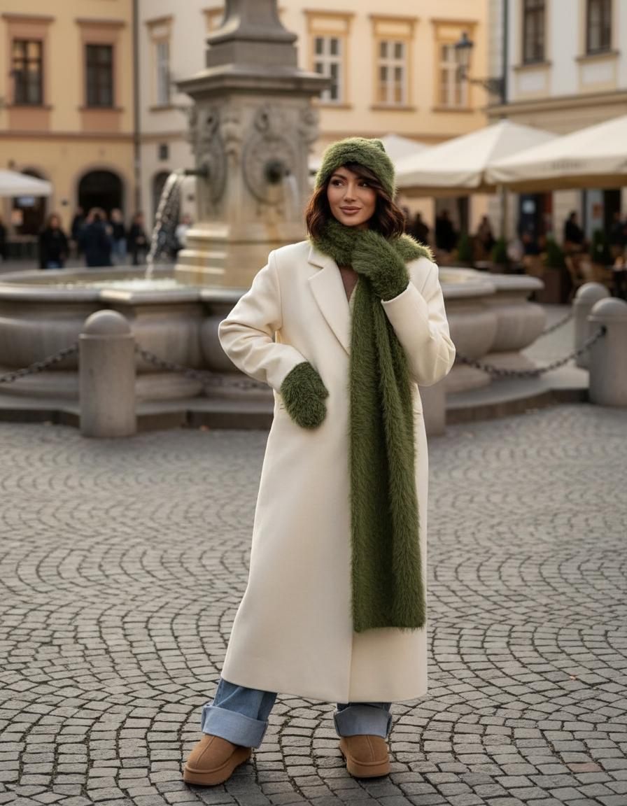 Важно: примеряйте пальто и шапку в комплекте с шарфом. Часто именно шарф становится связующим звеном. Без него образ может «развалиться».