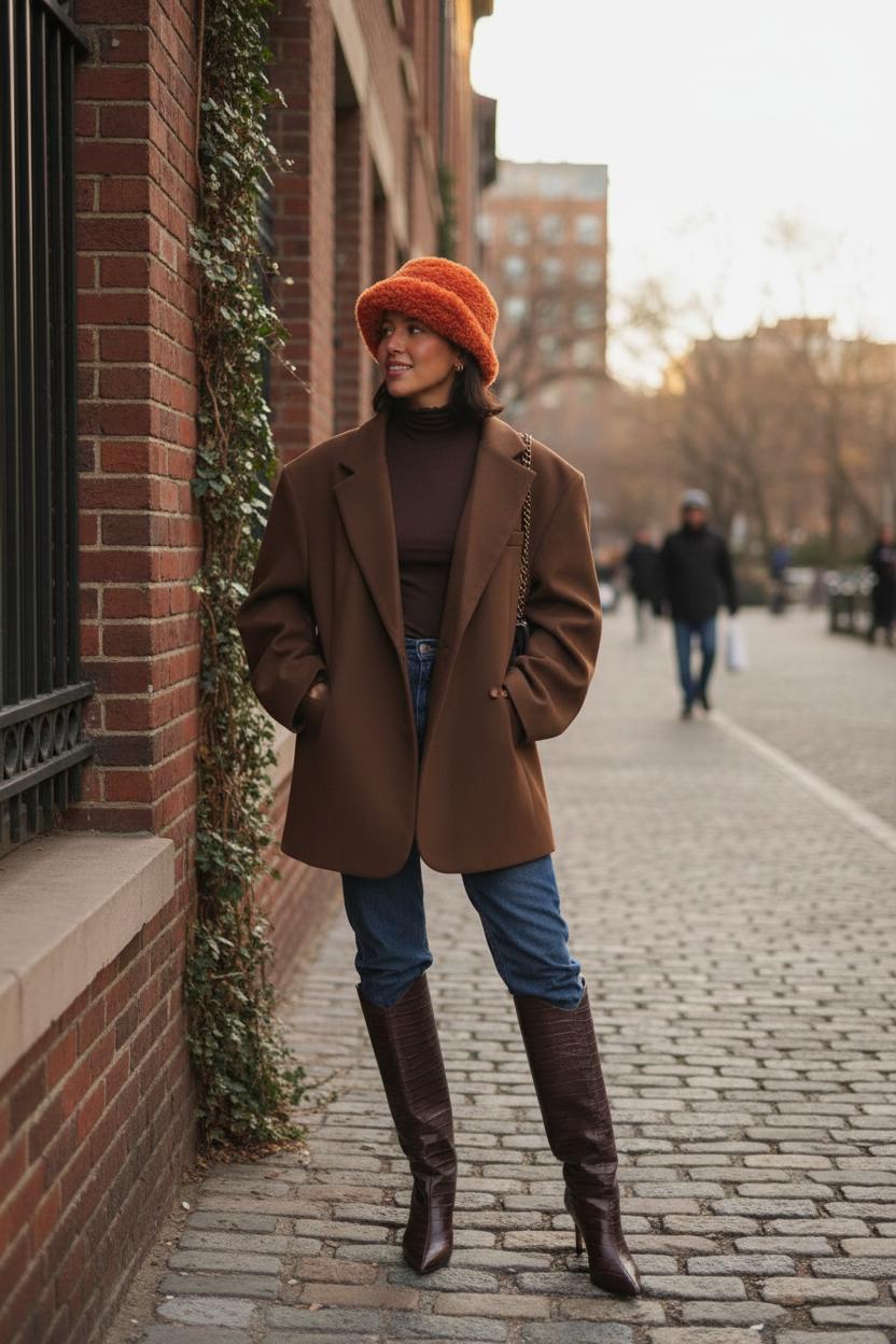 Вот здесь очень легко ошибиться. Шапка + длинные серьги + массивный шарф = слишком много всего. Работает правило: один яркий акцент. Если у вас в ушах длинные серьги — пусть шапка будет лаконичной. Если хотите выделить шапку с необычной вязкой или мехом — серьги лучше заменить на маленькие гвоздики.