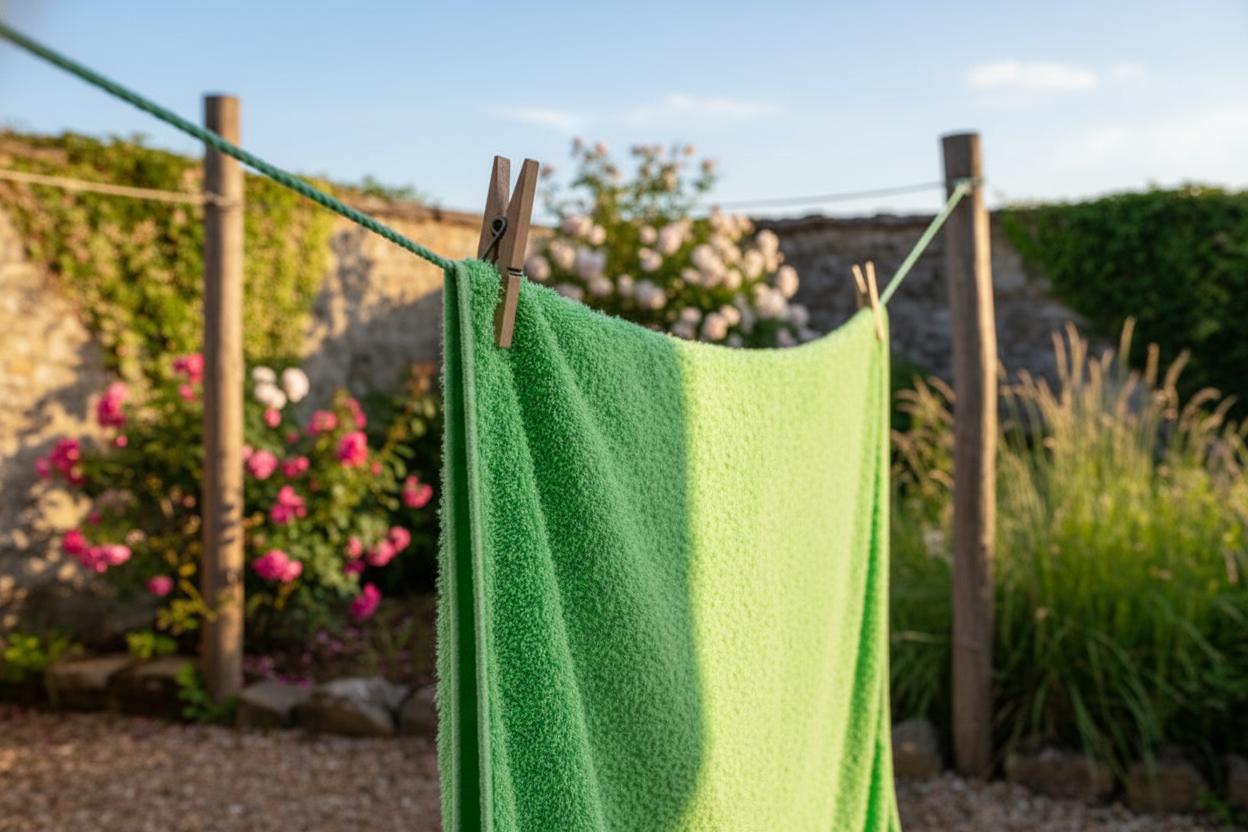 - Сушка. Самый лучший вариант — расправить и высушить на воздухе, вдали от батарей и прямого солнца. Тяжёлые ткани, вроде махры или велюра, сушим на плечиках с широкой формой — иначе вытянутся. Флис и микрофибра допускают сушку в машинке, но только при невысокой температуре и без пересушивания. Если не уверены — лучше на бельевой верёвке, чем в барабане.