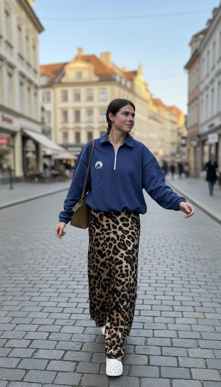 В российских реалиях блогеры делают ставку на практичность: юбки миди + водолазки, пальто с принтом + джинсы, даже спортивные костюмы с акцентными деталями. Леопард появляется там, где раньше царила «база» — и делает образы ярче.