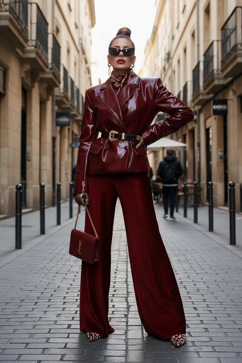 Важно: матовая ткань делает образ сдержанным и современным. Глянец добавляет риск — использовать его стоит очень аккуратно, особенно в городском стиле.