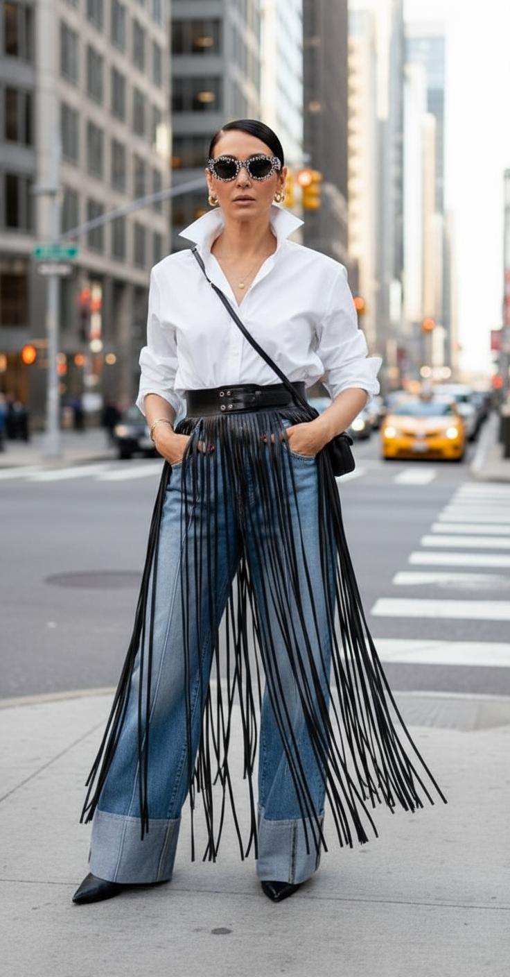 Если однотонные джинсы — это «база», то модели с принтами и эффектами — настоящие герои гардероба. В 2025 году дизайнеры явно решили, что скучать мы не должны. Джинсы превращаются в полотно для творчества, и это видно по подиумам от Копенгагена до Парижа.