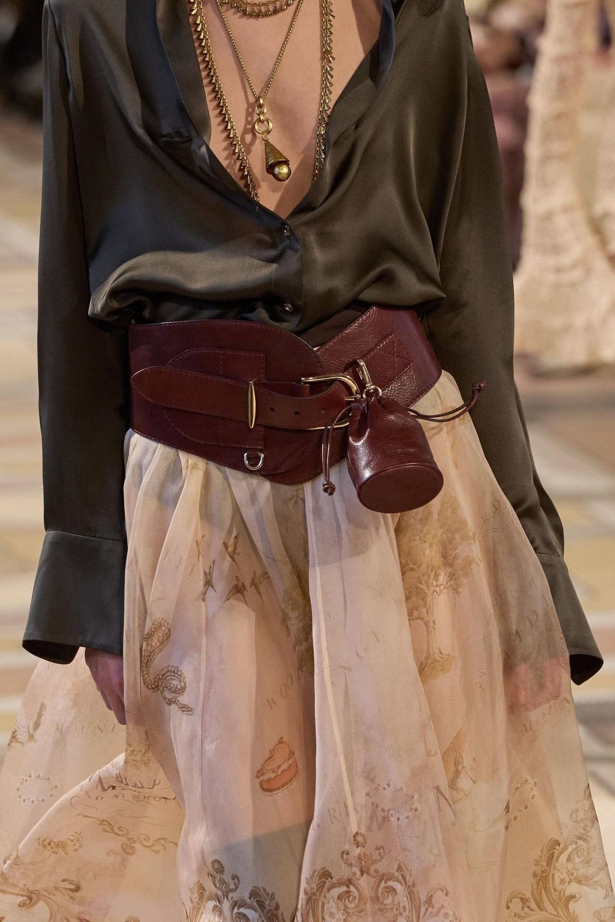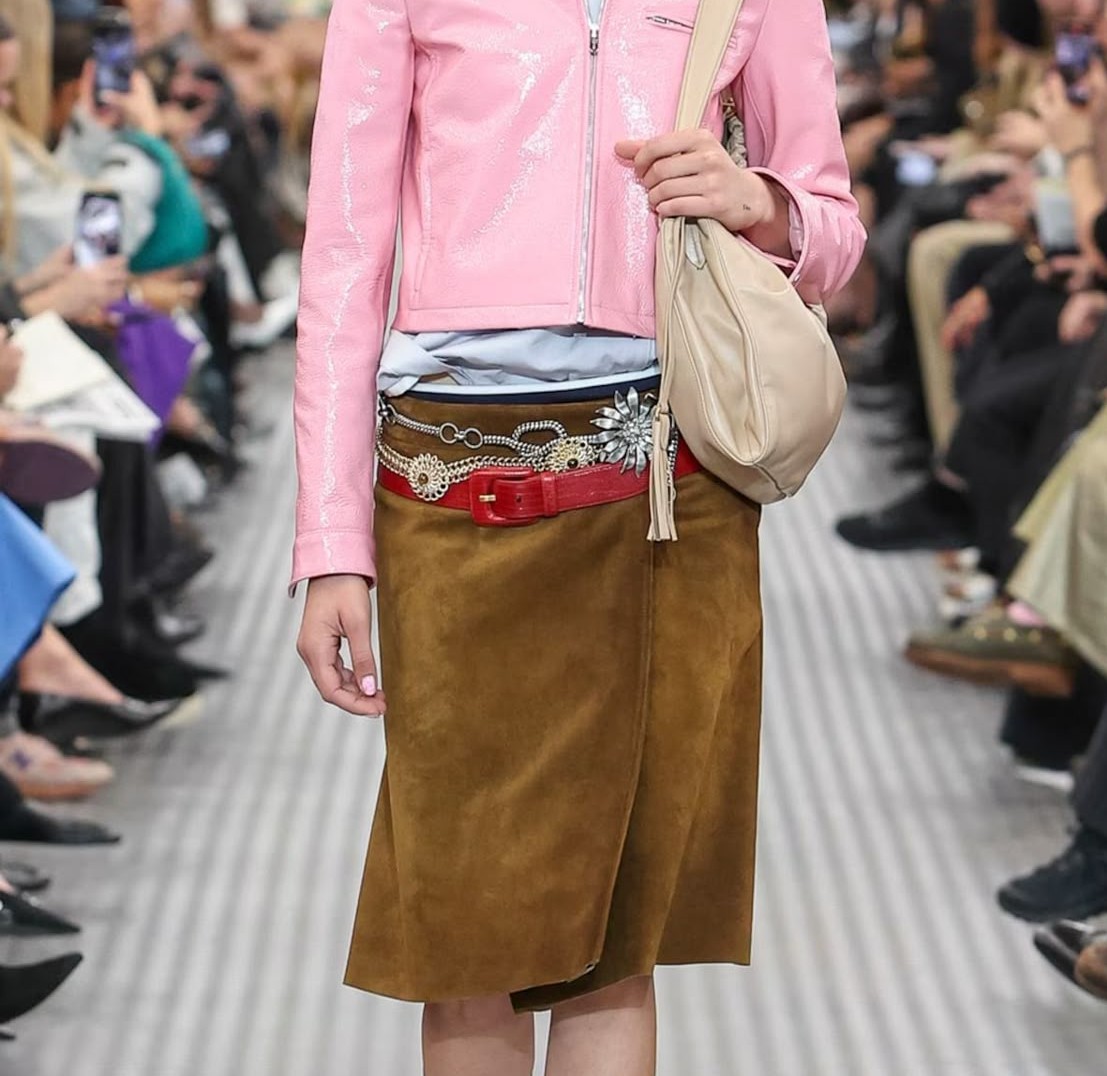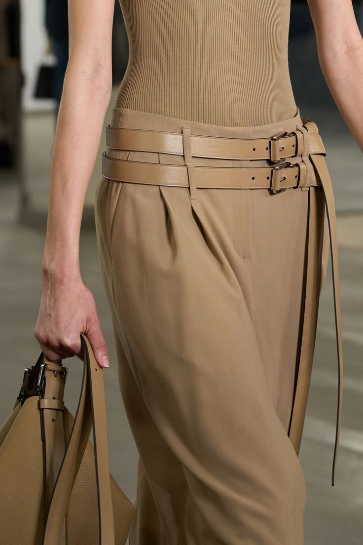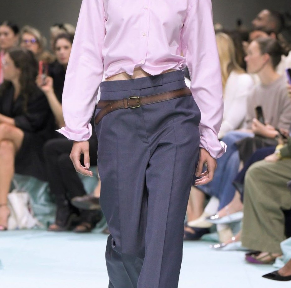 На подиумах его не просто носят — его показывают, на него делают ставку. Saint Laurent подчёркивает талию ультратонкими кожаными лентами, Coperni завязывает ремень… на бицепсе, а Miu Miu вывел идею ремня за пределы привычного, сделав из него почти браслет или украшение.
