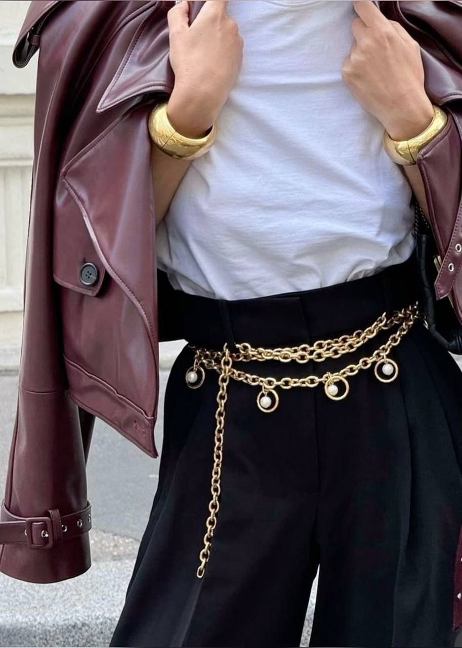 На бёдрах — привет из Y2K. Носим с джинсами на низкой посадке, мини-юбками и топами. Лучше, если ремень будет цепочкой или с подвесками — это добавит движения и модного шика.