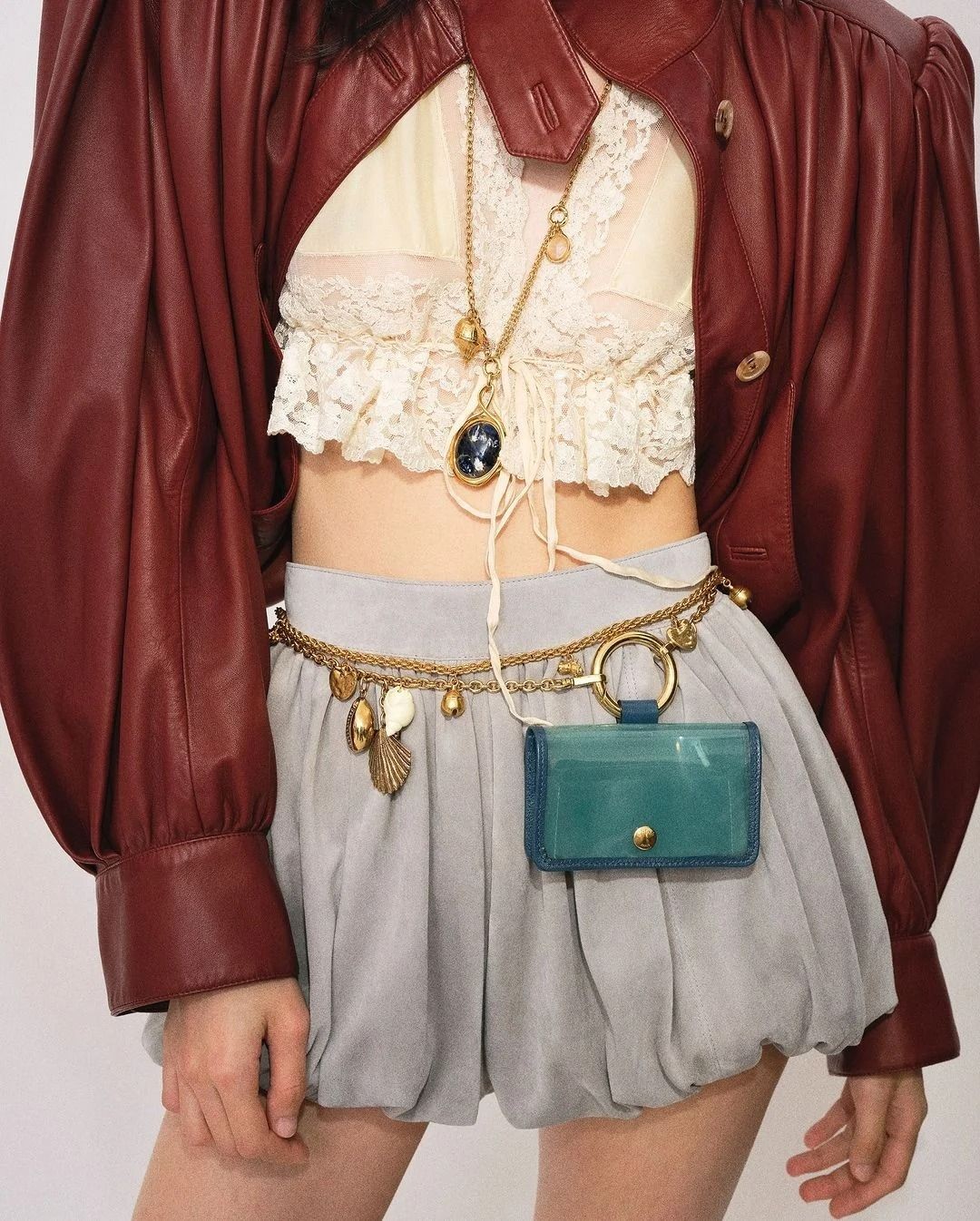 Ремень на плече — свежий и смелый приём, вдохновлённый показами Coperni и Miu Miu. Чаще всего используется узкий ремешок с декоративной пряжкой. Надевается как лямка или наискосок — и сразу создаёт подиумное настроение.