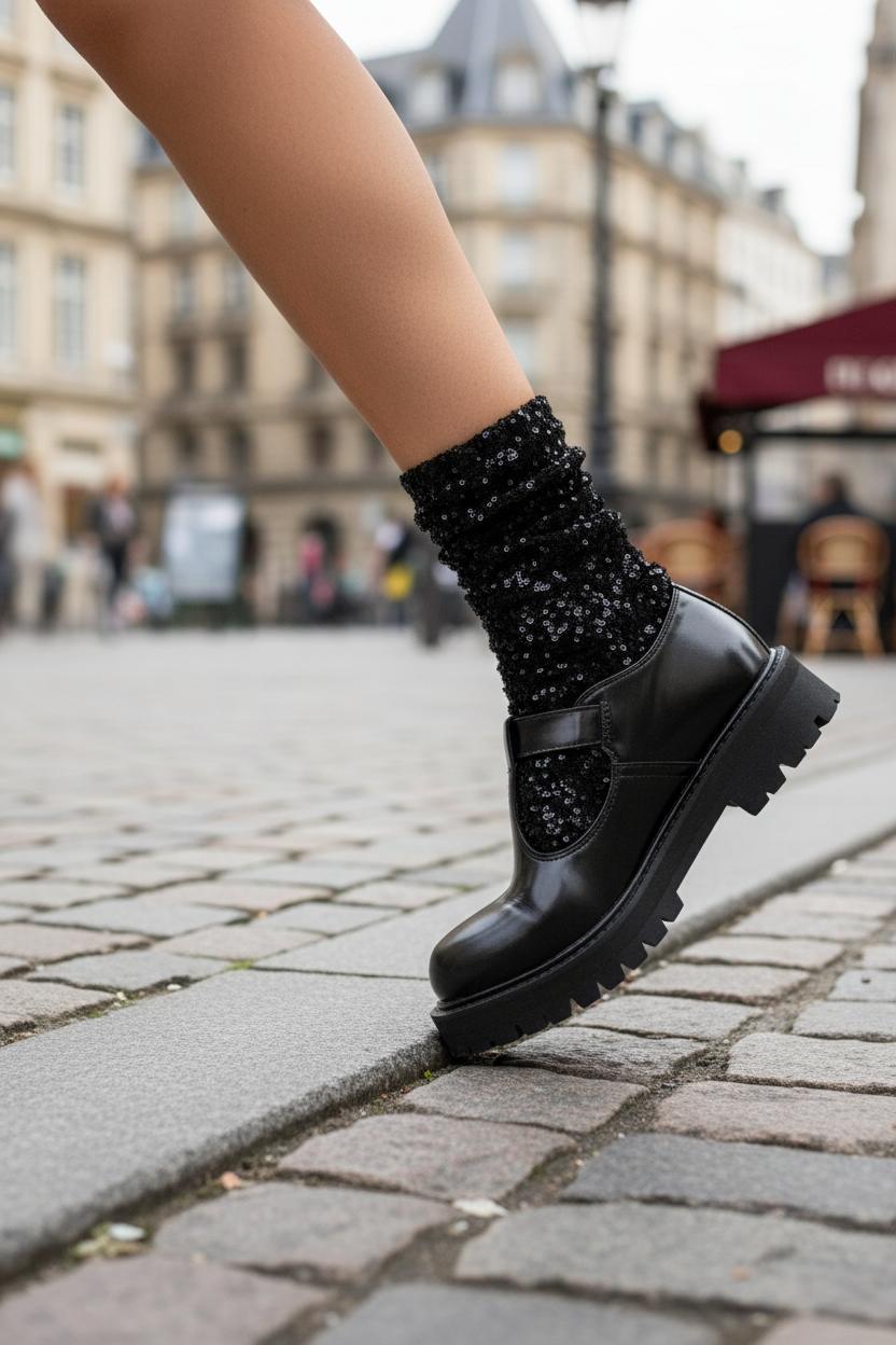 Глиттер повсюду — блеск остался, но дозировано. Если раньше туфли могли сиять как новогодняя игрушка, сейчас предпочтение отдают более сдержанному металлику или точечным акцентам.