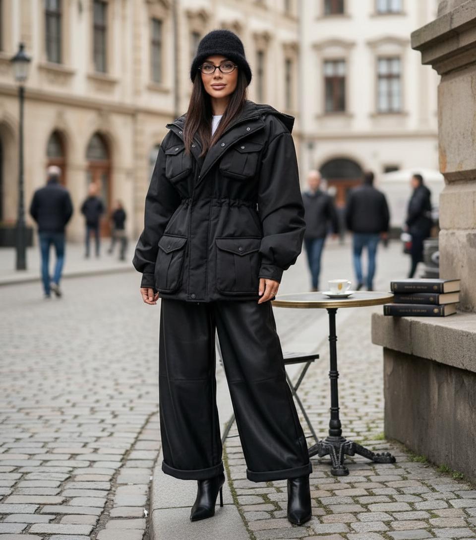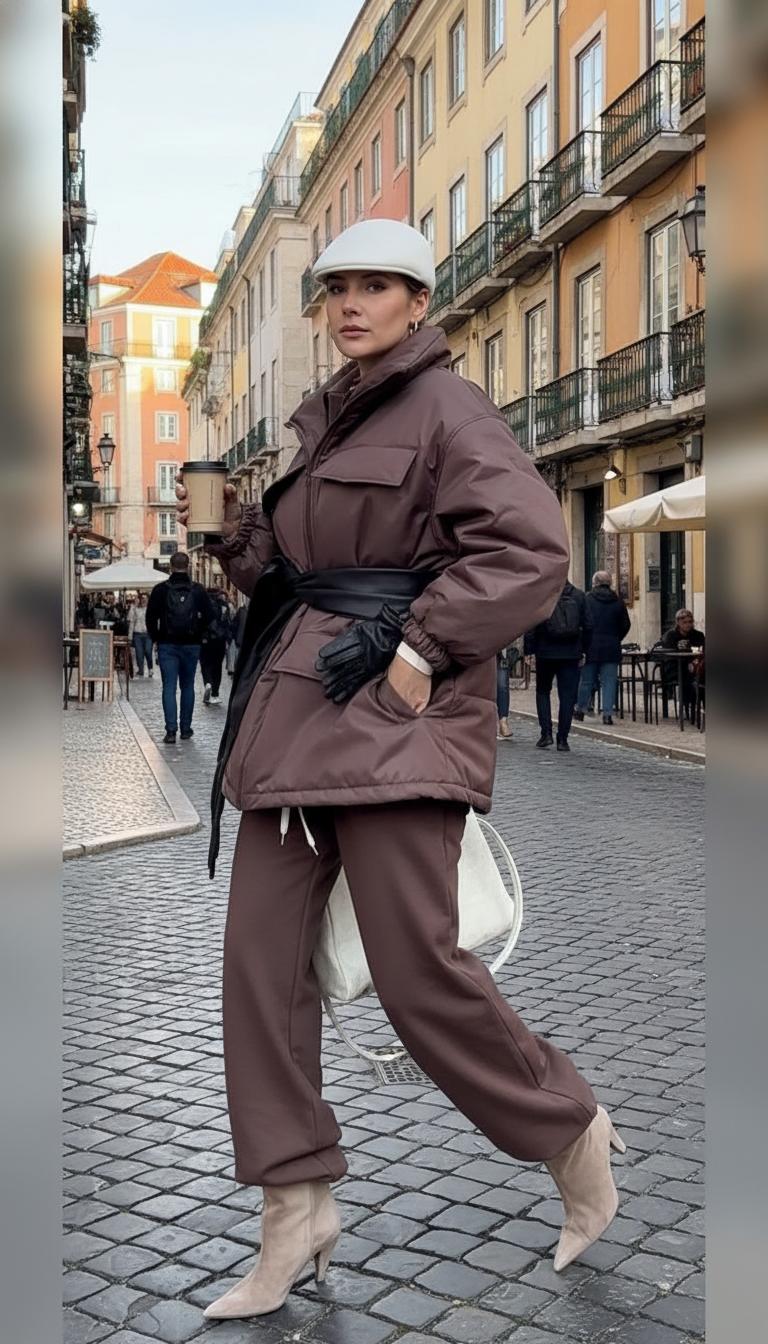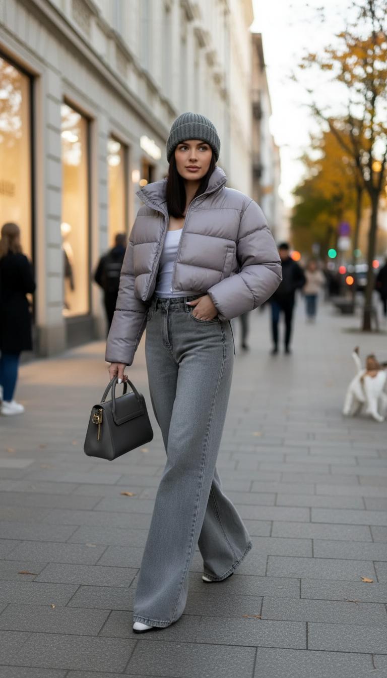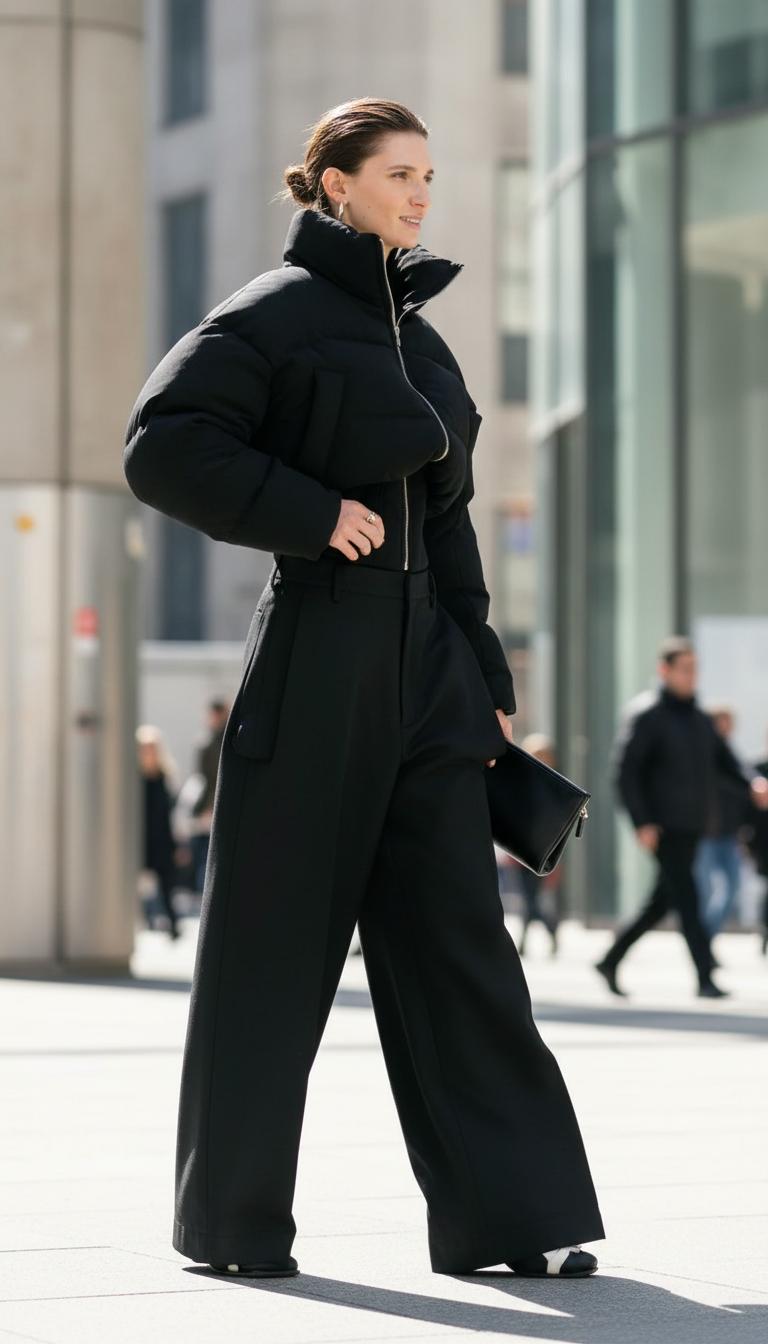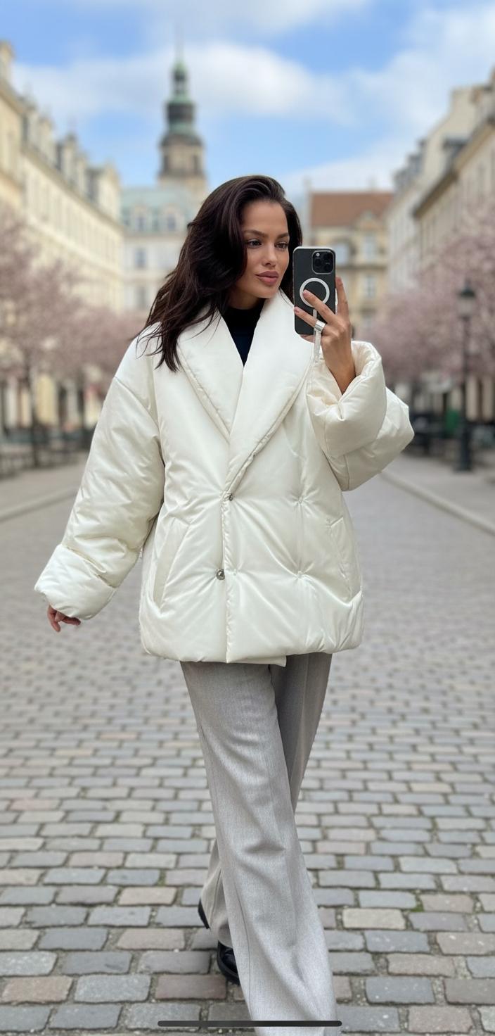 Важно: не бойтесь «объёма». Если верх визуально широкий — балансируйте низом. Прямые или узкие джинсы, аккуратная обувь, пояс на талии — и даже пуховик-кокон выглядит женственно.