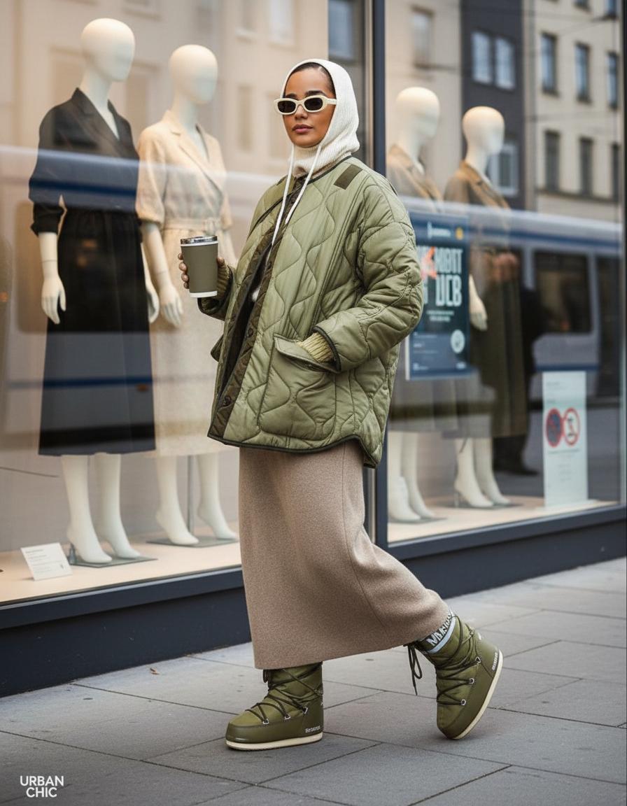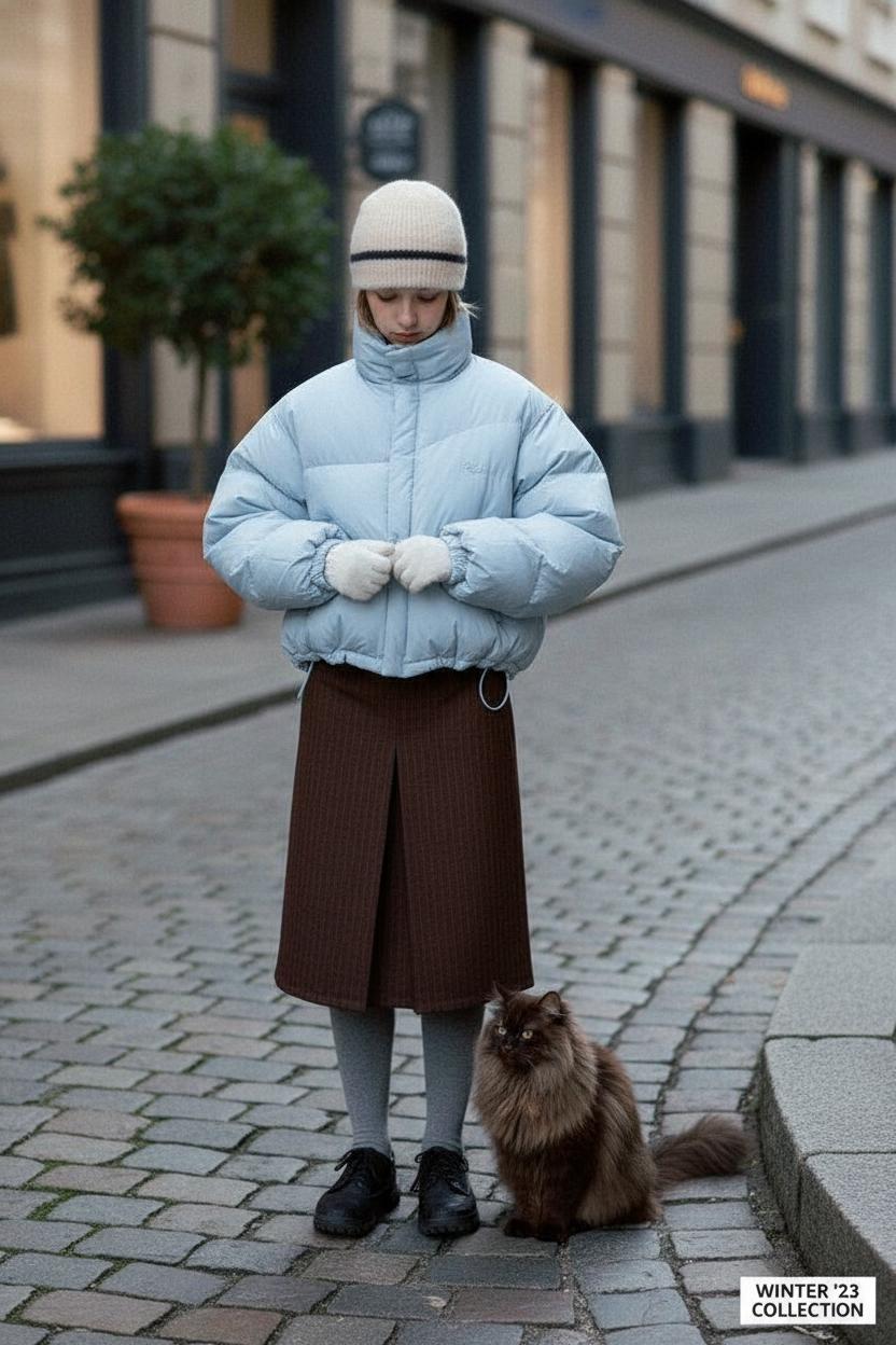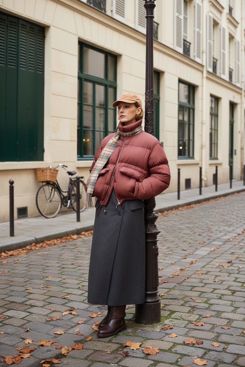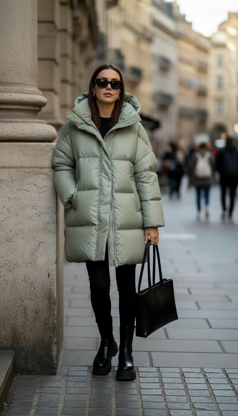 Макси-длина. Длинные пуховики до середины икры — не только про «северный ветер». Они вытягивают силуэт и дружат с ботфортами, грубыми ботинками и даже кроссами. Лайфхак: выбирайте разрезы по бокам — в машине и метро жить легче.