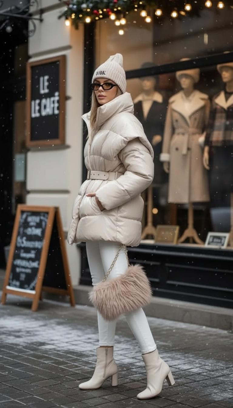 Аксессуары: мини-сумка через плечо, тонкий шарф. Секрет — контраст фактур: матовый пуховик + гладкая кожа.
