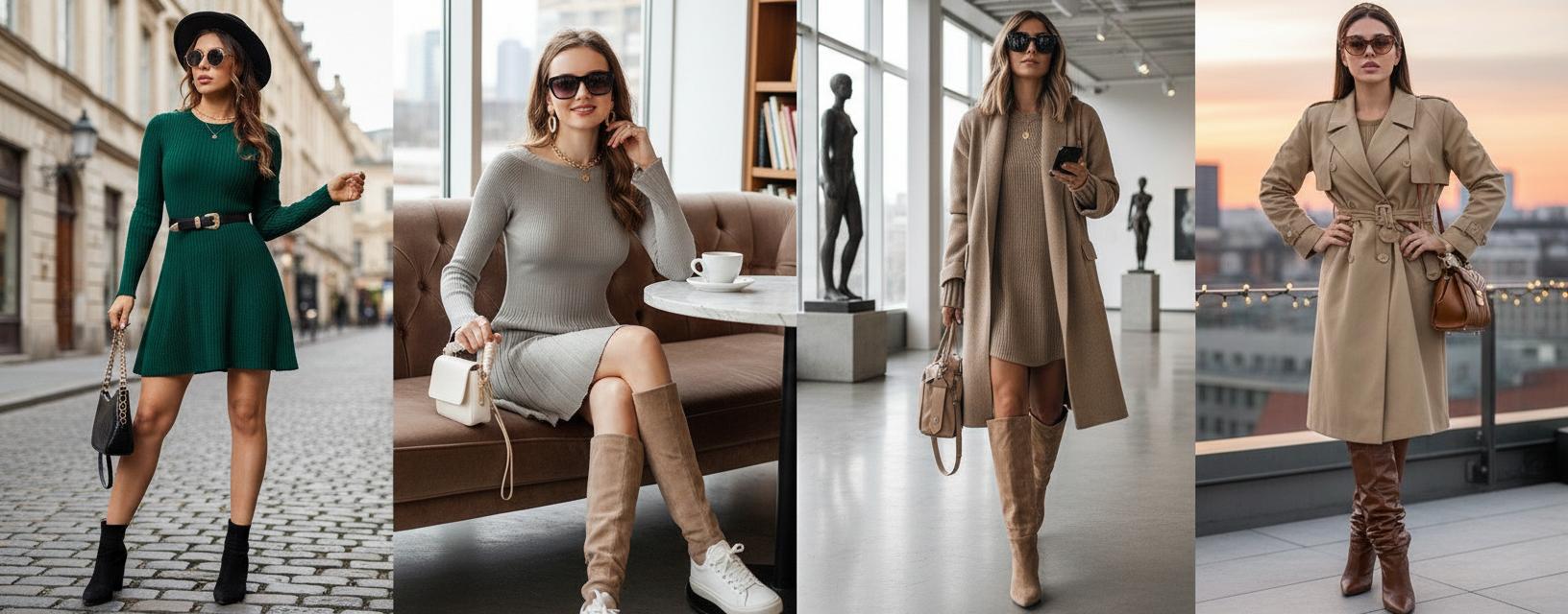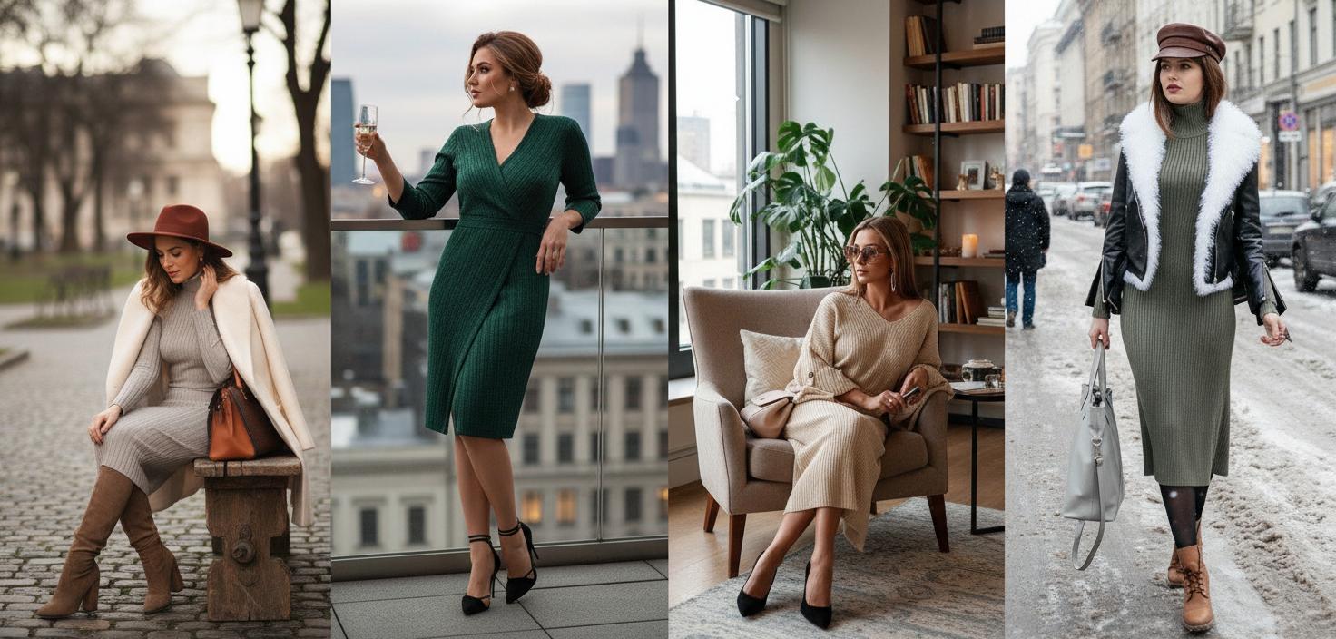 Многие удивляются: как носить платье зимой? Очень просто — многослойность спасает. Под платье — водолазка, сверху — дублёнка или пальто-халат, а ещё можно добавить жилет или пуховик. Обувь — ботфорты, утеплённые ботинки, угги.