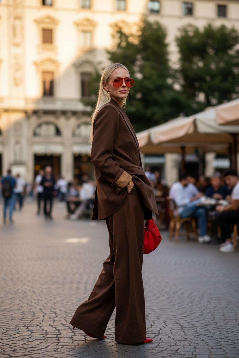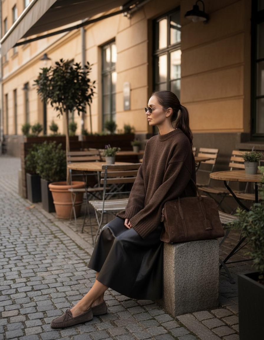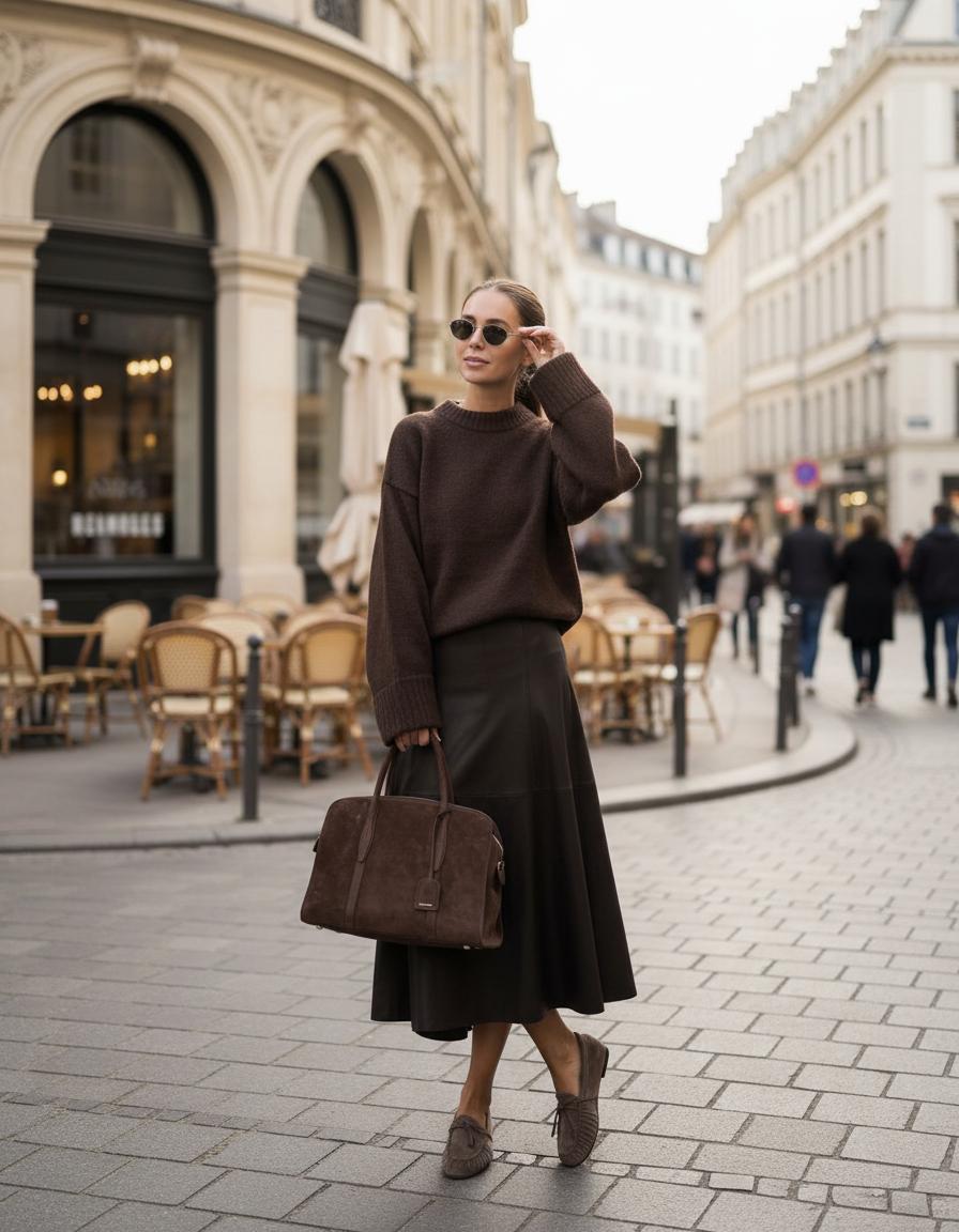 Аксессуары — это как приправы. Шоколадный сам по себе вкусный, но правильно подобранные обувь и сумка делают образ законченным. Здесь главное — решить: вы поддерживаете цвет или создаёте осознанный контраст.