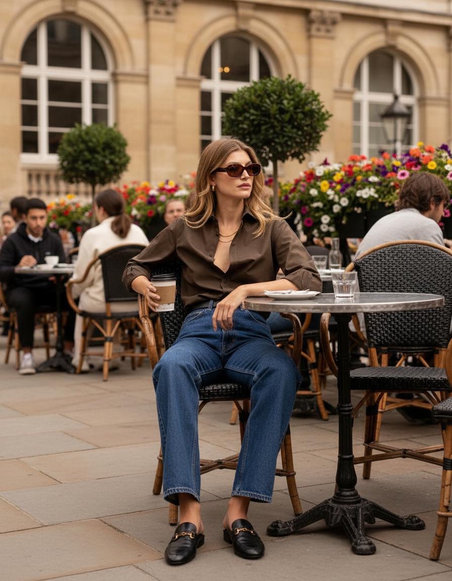 Формула: шоколадный пиджак + молочная рубашка + тёмные джинсы + тонкое золото.