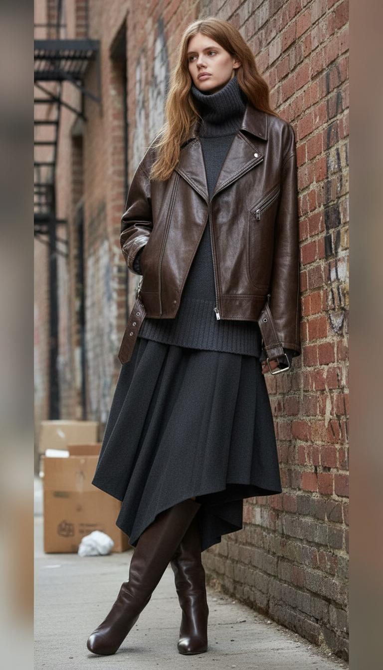 Меняем фактуры, а не палитру. Матовая кожа + мягкий трикотаж + гладкий сатин/шёлк — классическая тройка.