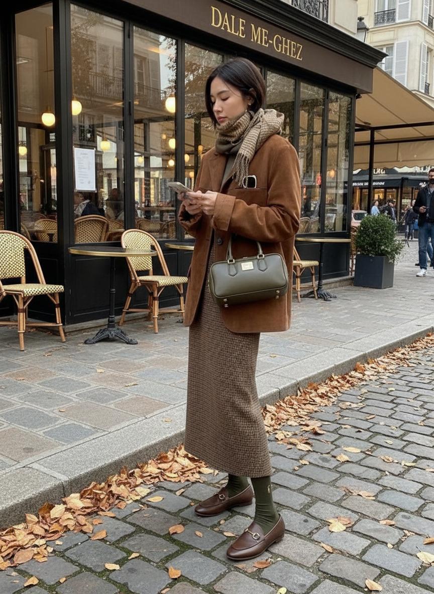 Разводим оттенки на пол-тона. Горький низ + классический верх + карамельный аксессуар — глубина без шума.