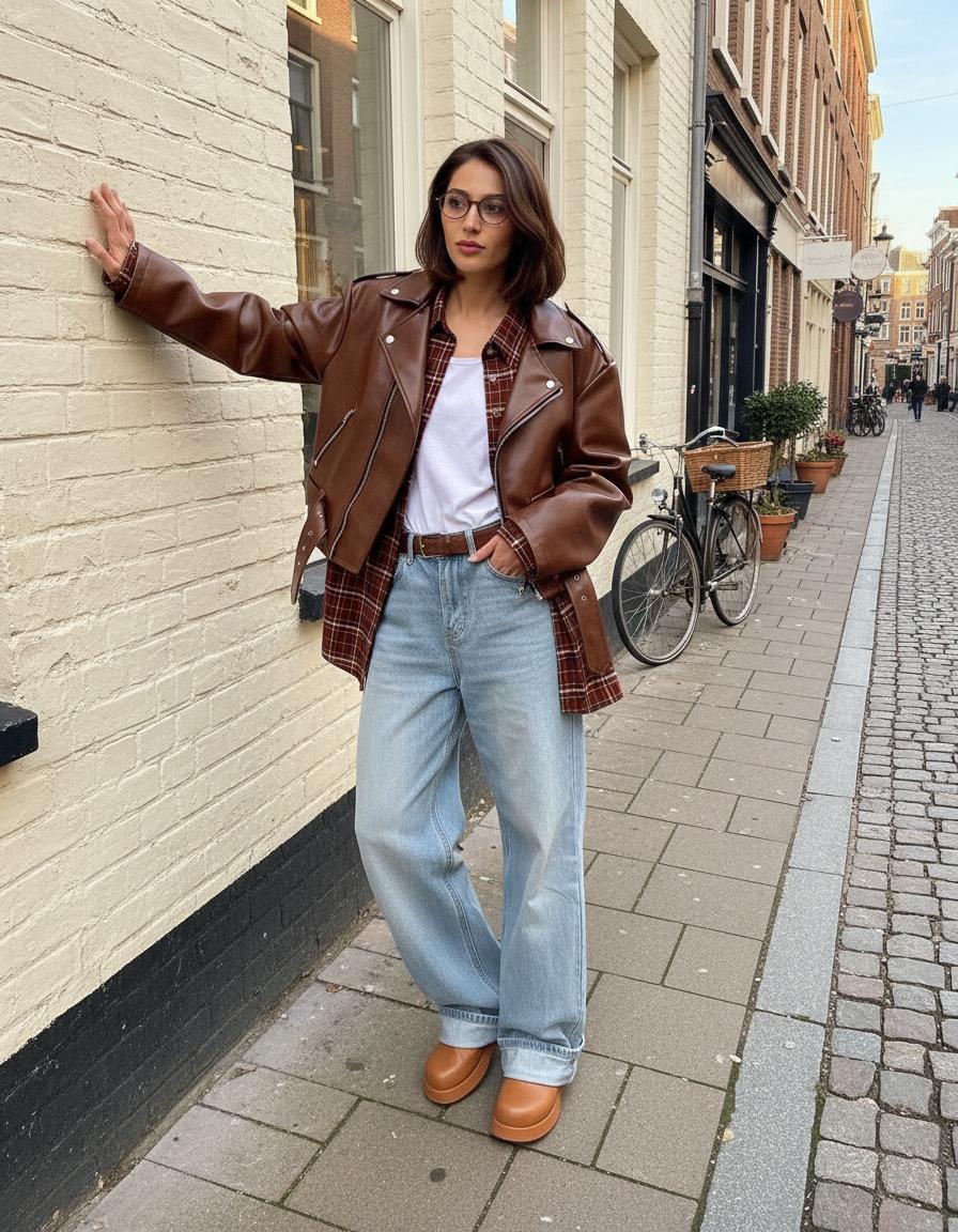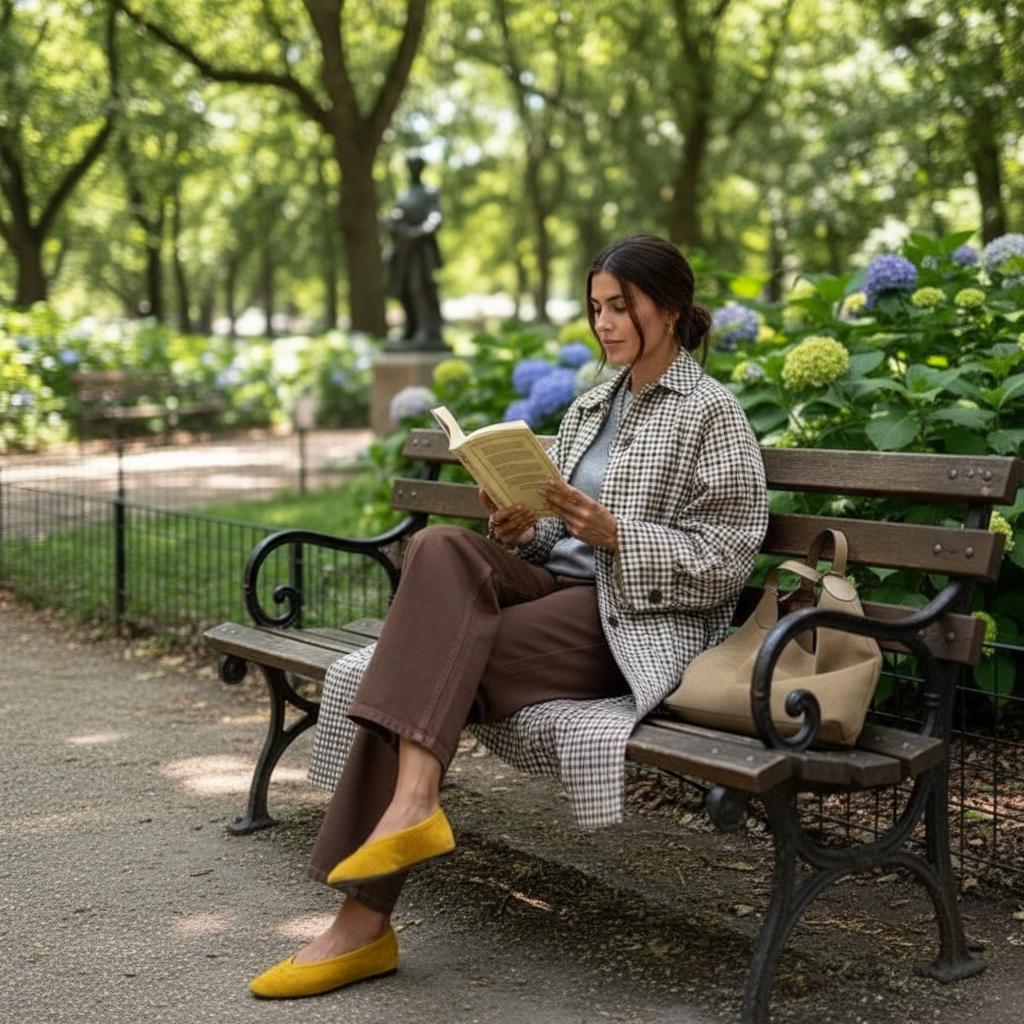 Светлая обувь (кремовые лоферы/ботинки) вытягивает силуэт и освежает фото.