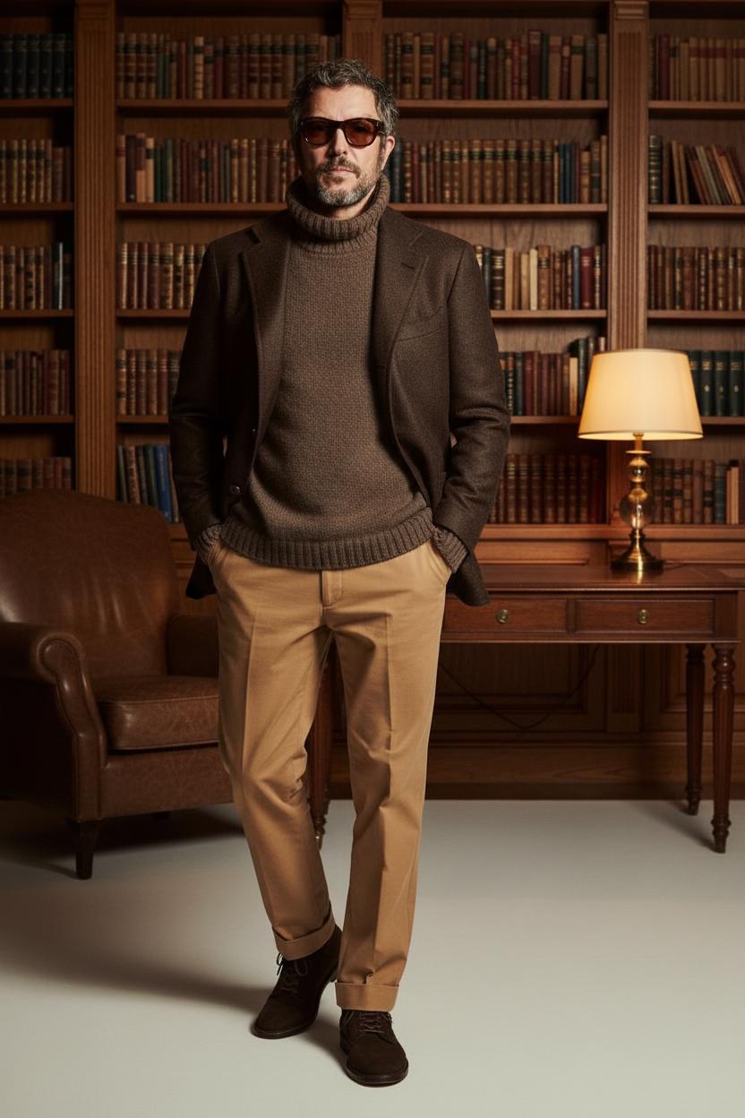 Вязаное поло классического шоколада + светлые chinos + лоферы — собранно, но без галстука.