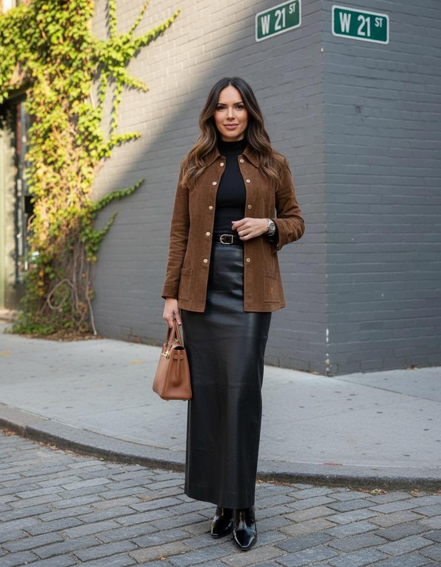 Формула: шоколадная кожа-рубашка + молочный топ + чёрные прямые брюки + серьги-кольца.