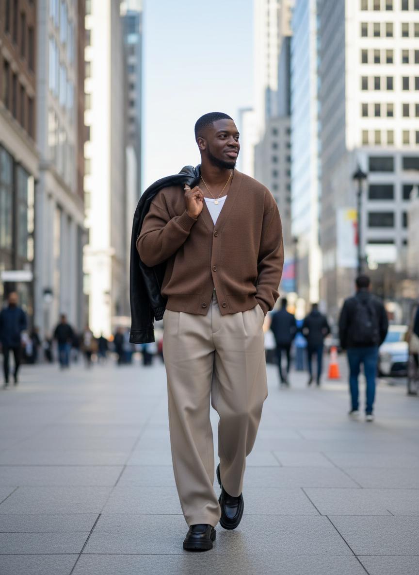 Шоколадный в мужском гардеробе решает сразу три задачи: выглядит богато, не «строг как чёрный» и легче комбинируется с повседневными вещами. Он дружит с денимом, серым, оливой и синим. А ещё помогает собрать капсулу из 6–8 вещей, которая закрывает офис, выходные и вечер.