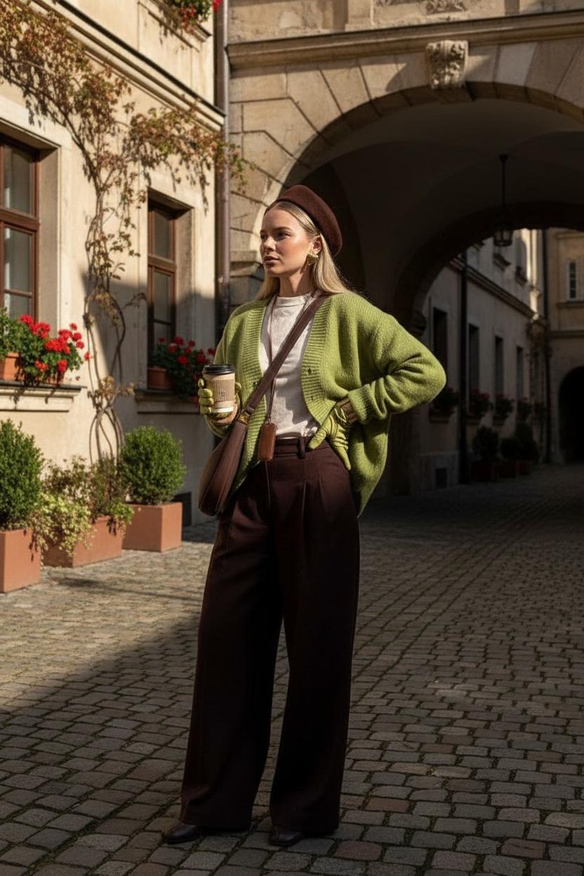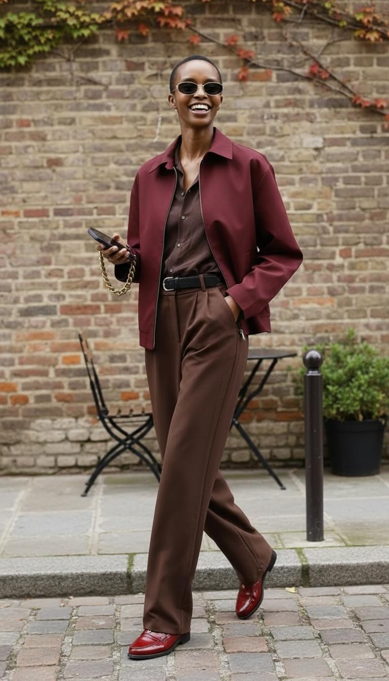 Шоколадный — ребёнок природы. Поставьте его рядом с оливой, хаки, бежем или песком — и получите спокойный, «земной» образ, который выглядит дороже, чем стоил. Это та самая тихая роскошь, где вещи не кричат, а шепчут: «Я собран(а)».