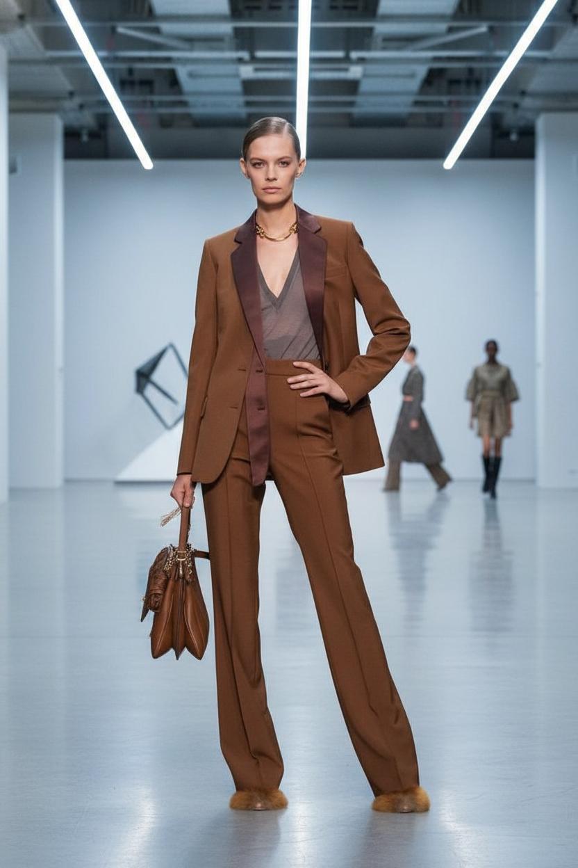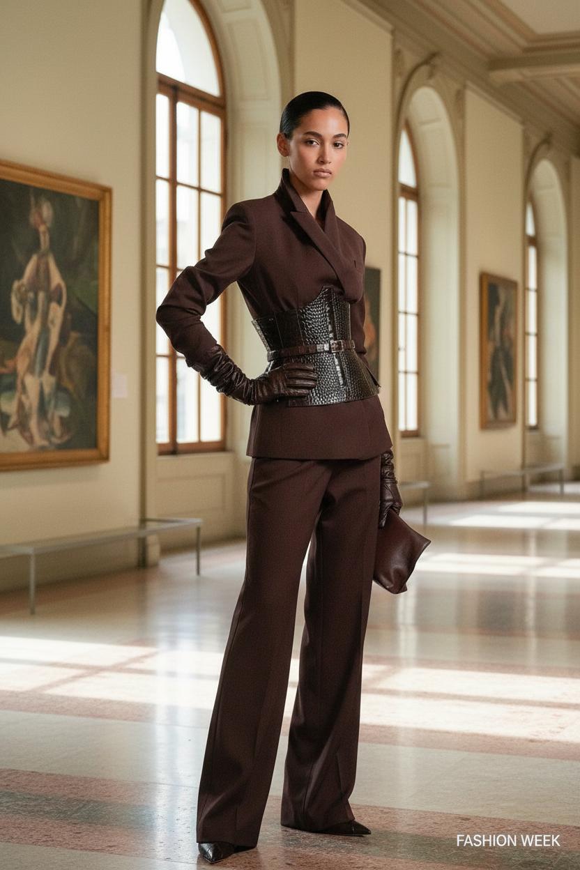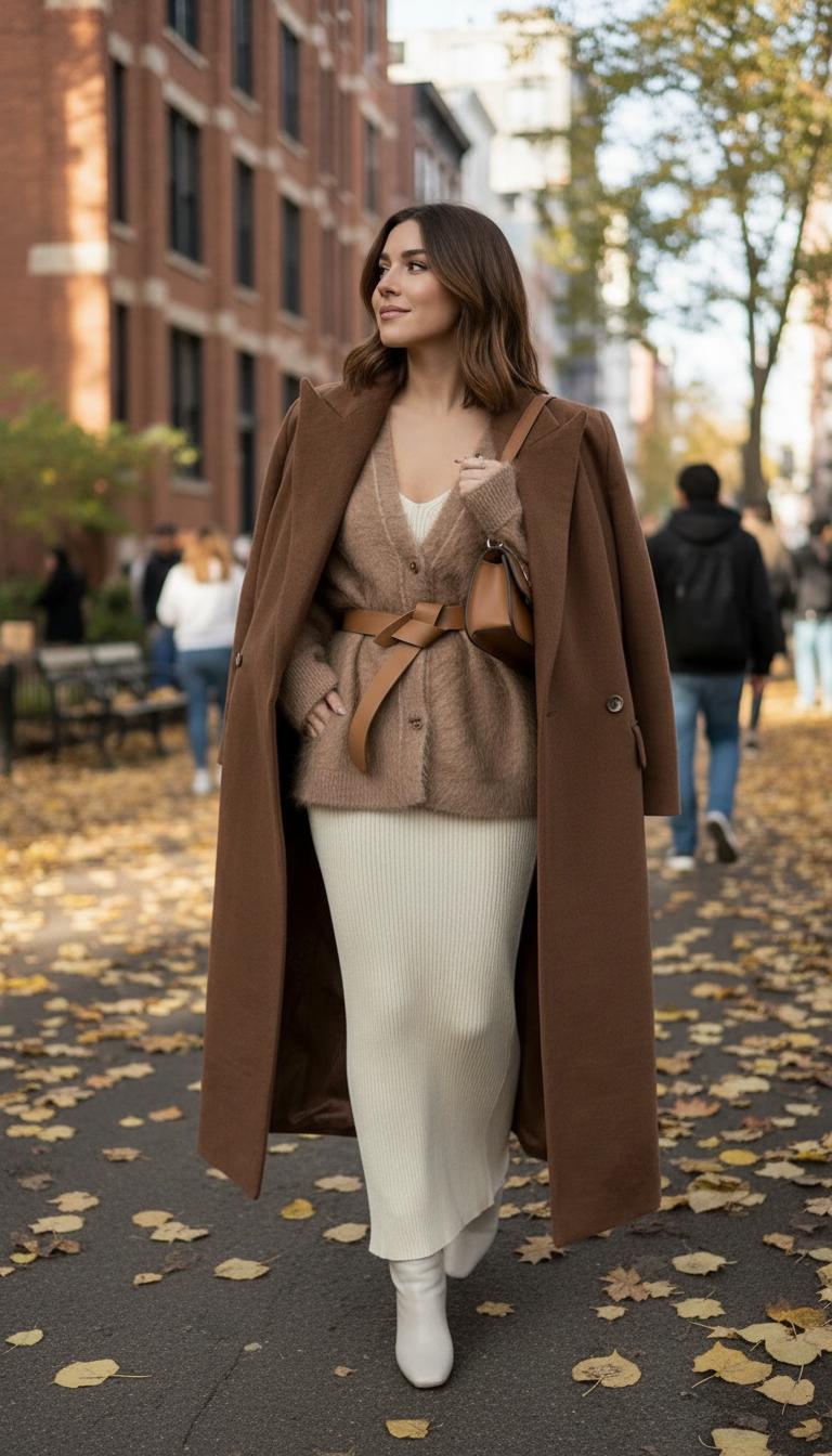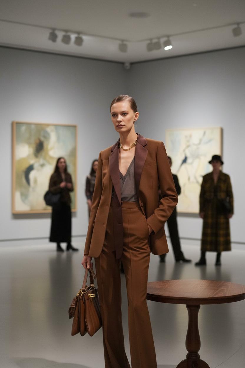 Монохром — это когда вы держите образ в одной гамме и играете фактурами, глубиной и пропорциями. Шоколадный для этого идеален: он даёт мягкую тень фигуре, выглядит «богато» и не требует ярких цветов, чтобы быть заметным.