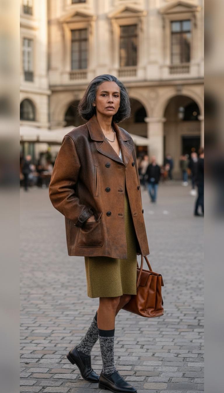 Важно: густые тёмные тона у лица в пасмурный день могут «утянуть» цвет кожи. Добавьте светлый слой (кремовый гольф, рубашка) или серёжки в тёплом металле — лицо сразу оживает.