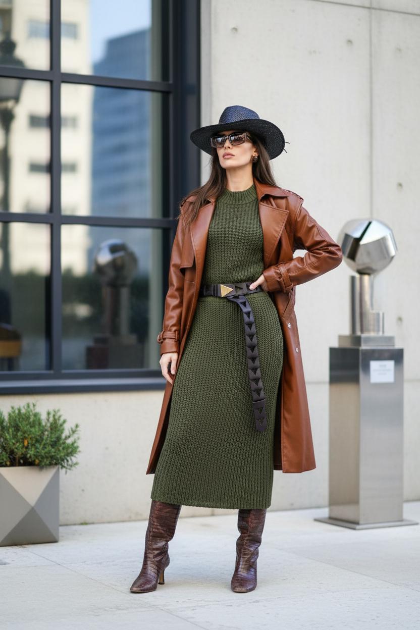 Тёплый подтон + классический: олива, беж, горчица; кожа/замша + вязка крупного плетения.