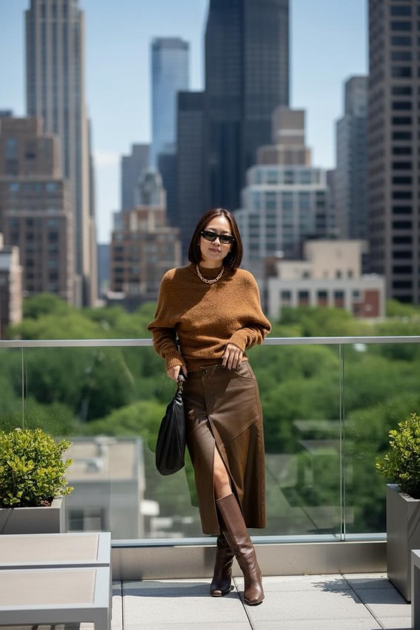 Формула: карамельный кардиган + горчичная майка + шоколадная кожаная юбка + тонкие золотые серьги.