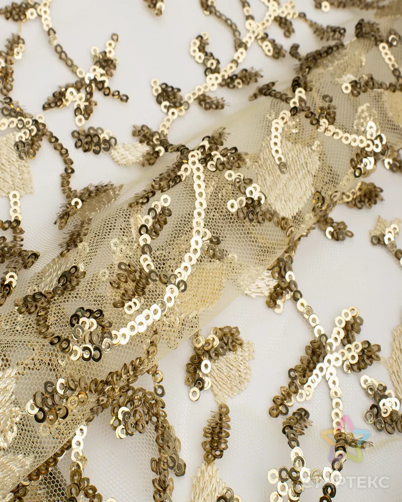 Ткань вышивка на сетке с пайеткой золотистого цвета (темное золото)